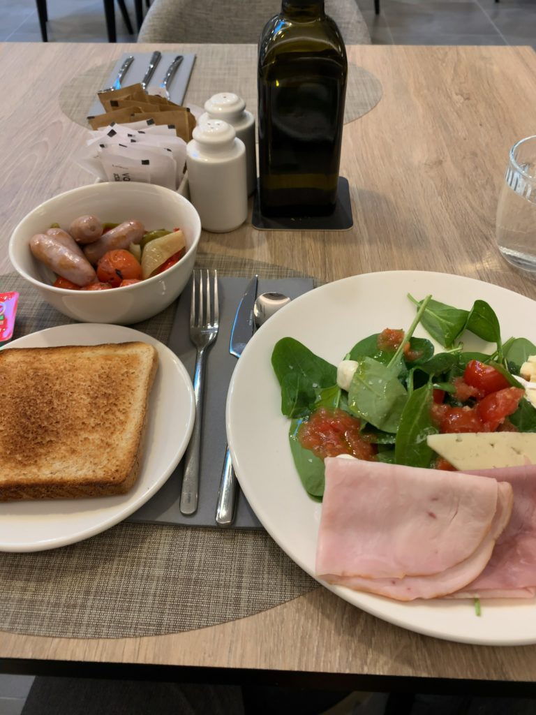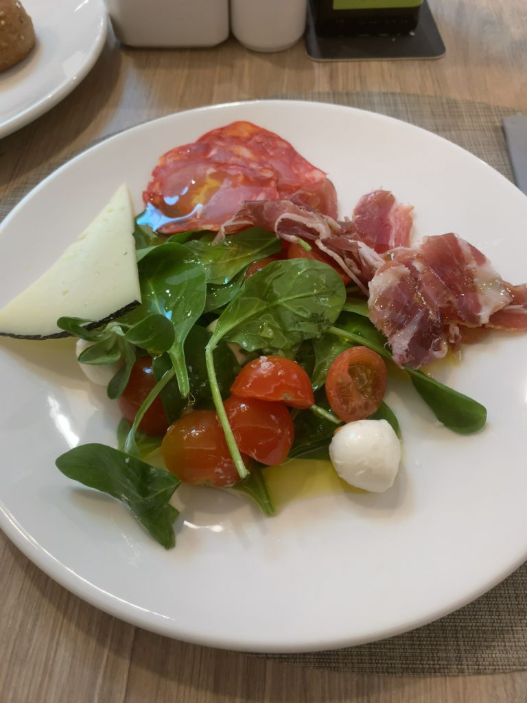 朝食ビュッフェがついています。朝からビールが飲みたくなるくらい、ハム、サラミ系が充実してます。