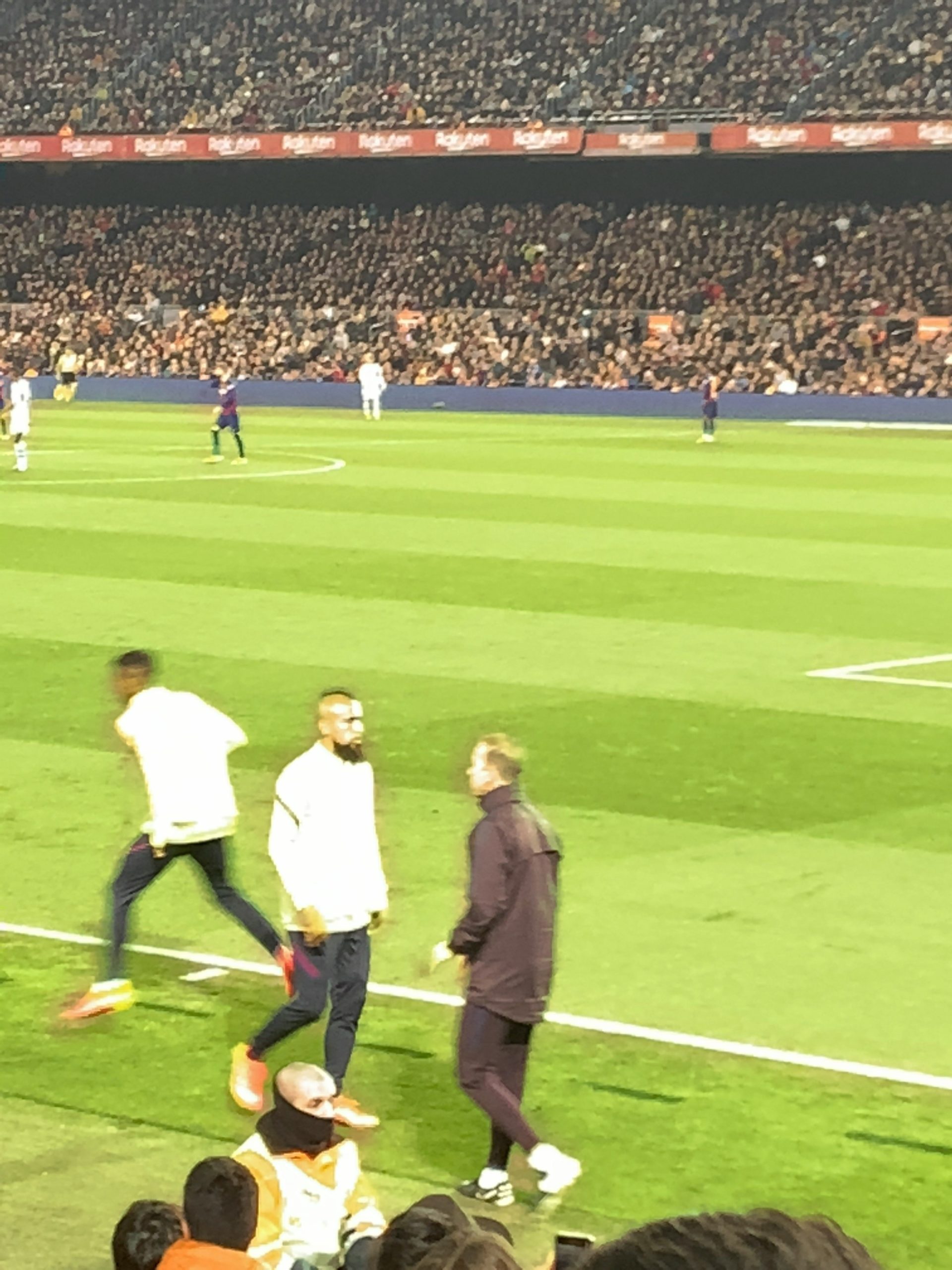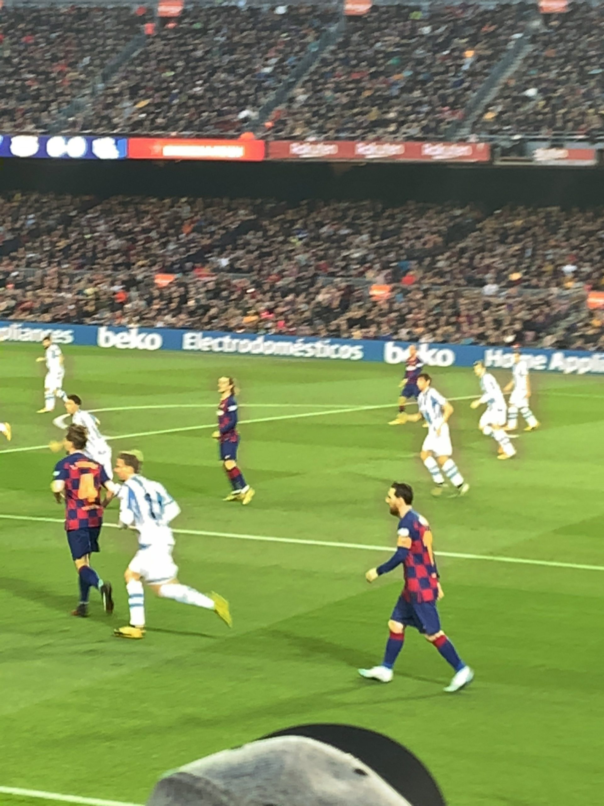 角の席だったので、うまくいけば、メッシがコーナーキックを蹴るかもと思ってたんですが、残念ながら、メッシのコーナーキックはなかったです。ただ、何度かかなり近いところまできて、目前でメッシを観ることができました。