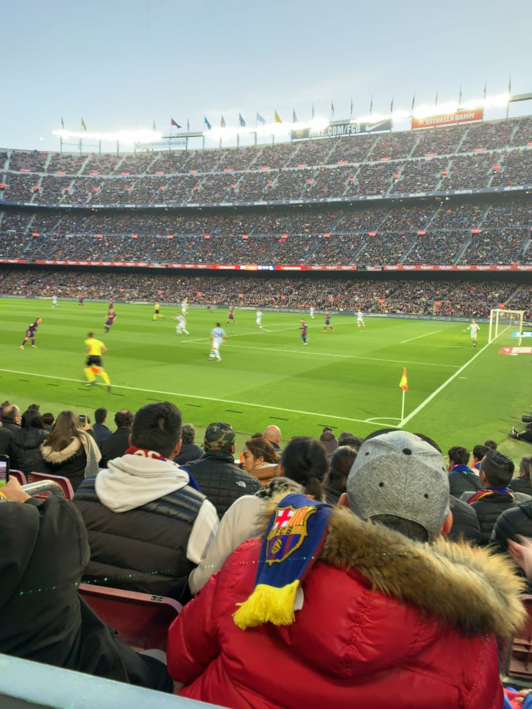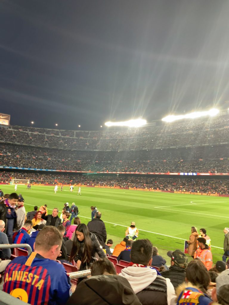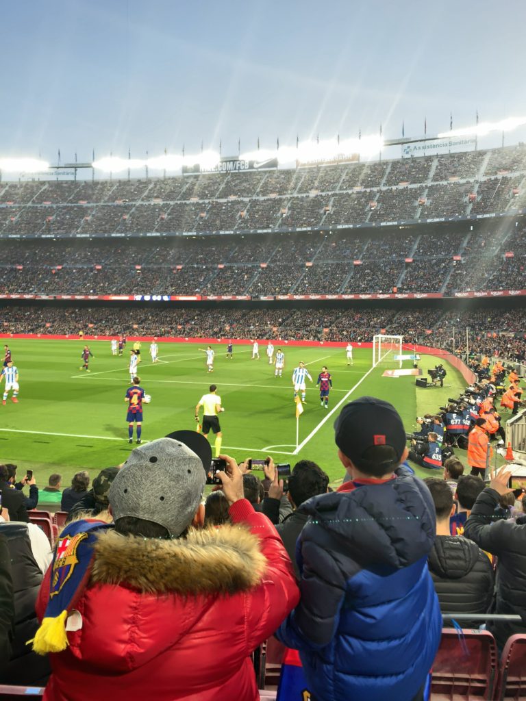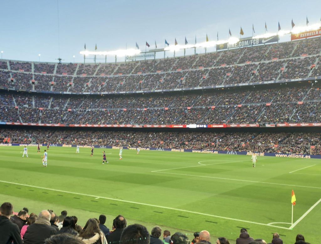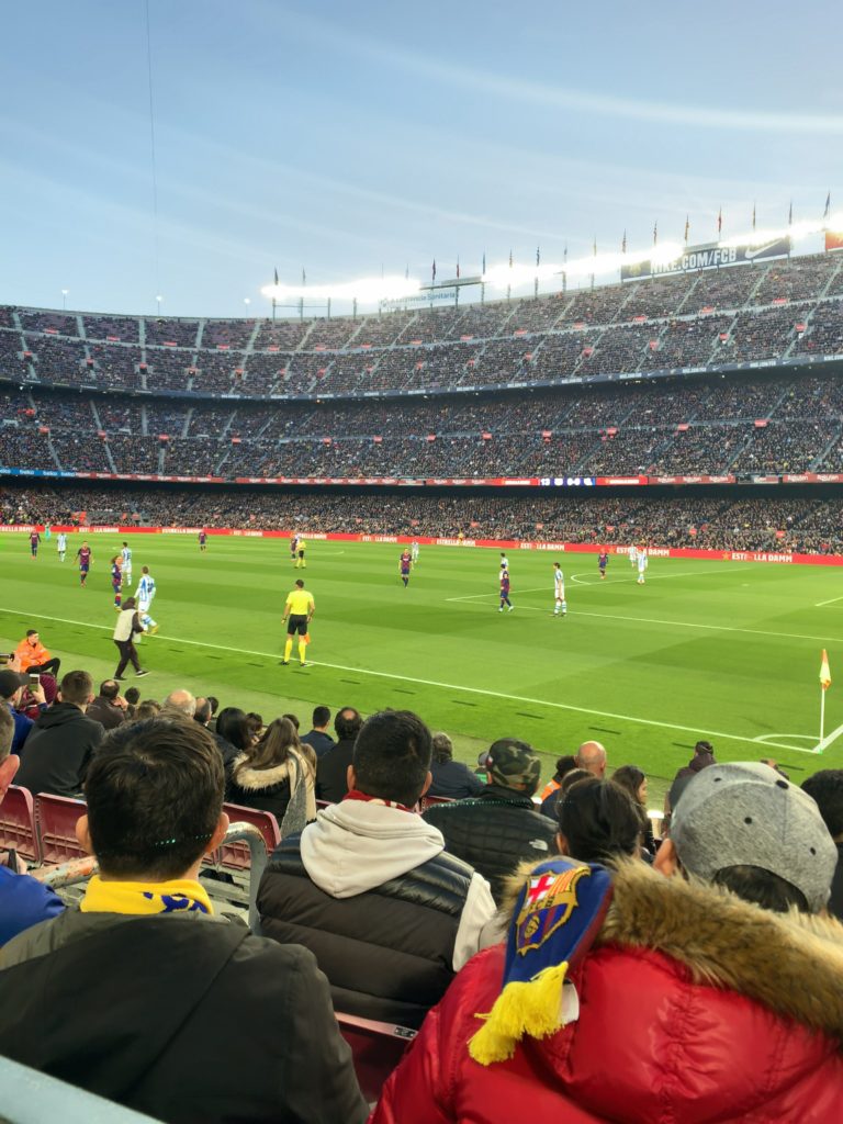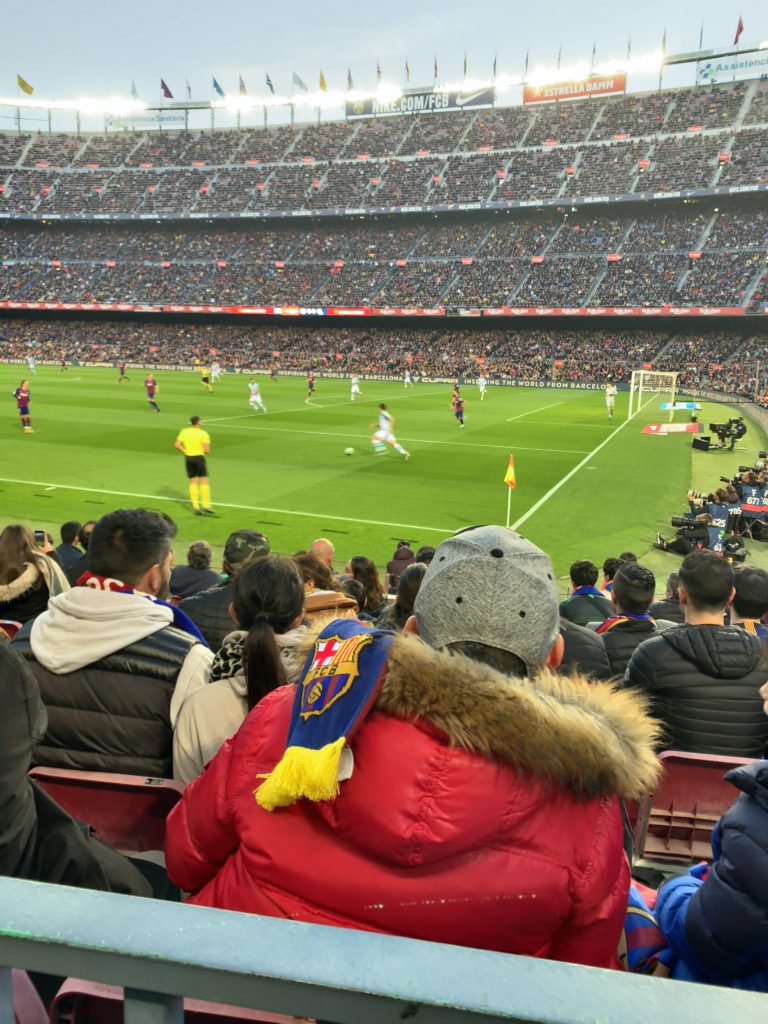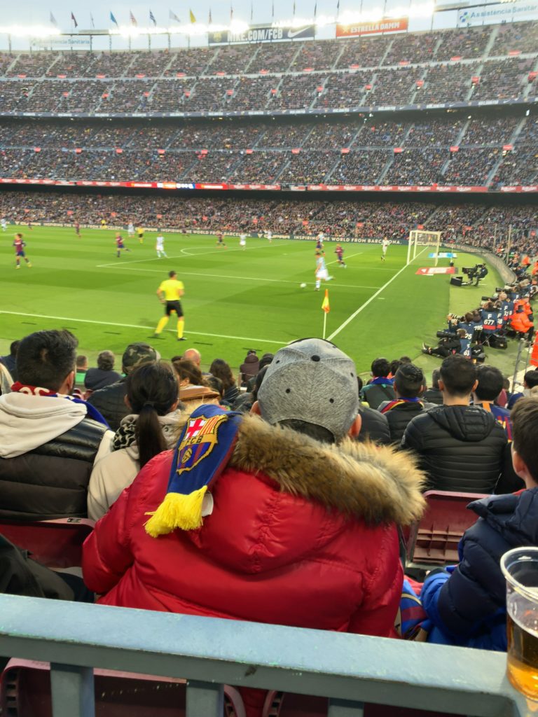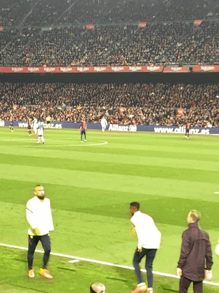 ホテルから、カンプノウまでは地下鉄で一時間弱くらいで着きました。試合開始の少し前に着いたのですが、観客席はほとんど埋まっていて、みんな気合いいれて観戦に来てます。